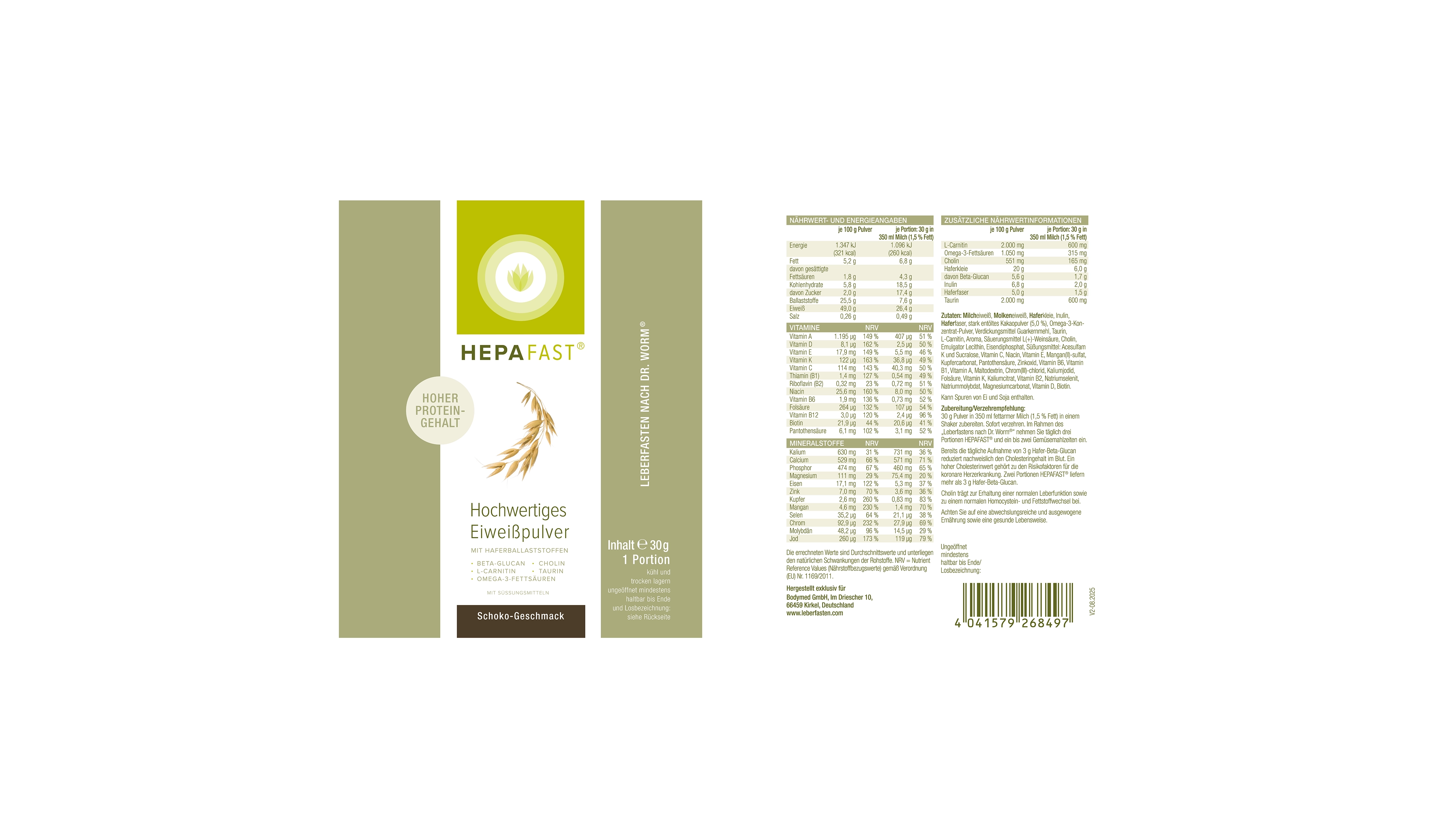 Entwickelt für Leberfasten nach Dr. Worm®, ist dieser leckere Protein-Shake nicht nur köstlich cremig, sondern liefert auch eine spezielle Rezeptur für den gezielten Abbau von Fett in der Leber und weiteren Organen. Die positiven Effekte der enthaltenen Wirkstoffe auf die Leberfunktion sowie den Fett- und Zuckerstoffwechsel sind in zahlreichen wissenschaftlichen Studien belegt. Hepafast® ist, neben der persönlichen Beratung, entscheidend für deinen Leberfasten-Erfolg und nicht mit handelsüblichen Shakes vergleichbar. Als hochwertiger Eiweiß-Shake liefert dir Hepafast® alle wichtigen Nährstoffe, die dein Körper braucht in optimaler Zusammensetzung. Daher erhältst du den hochwertigen Protein-Shake auch nur in Kombination mit einer persönlichen Beratung in deinem Bodymed-Center vor Ort oder hier im Bodymed-Webshop nach Eingabe deines persönlichen myKey-Codes, den du in deinem Bodymed-Center erhältst.