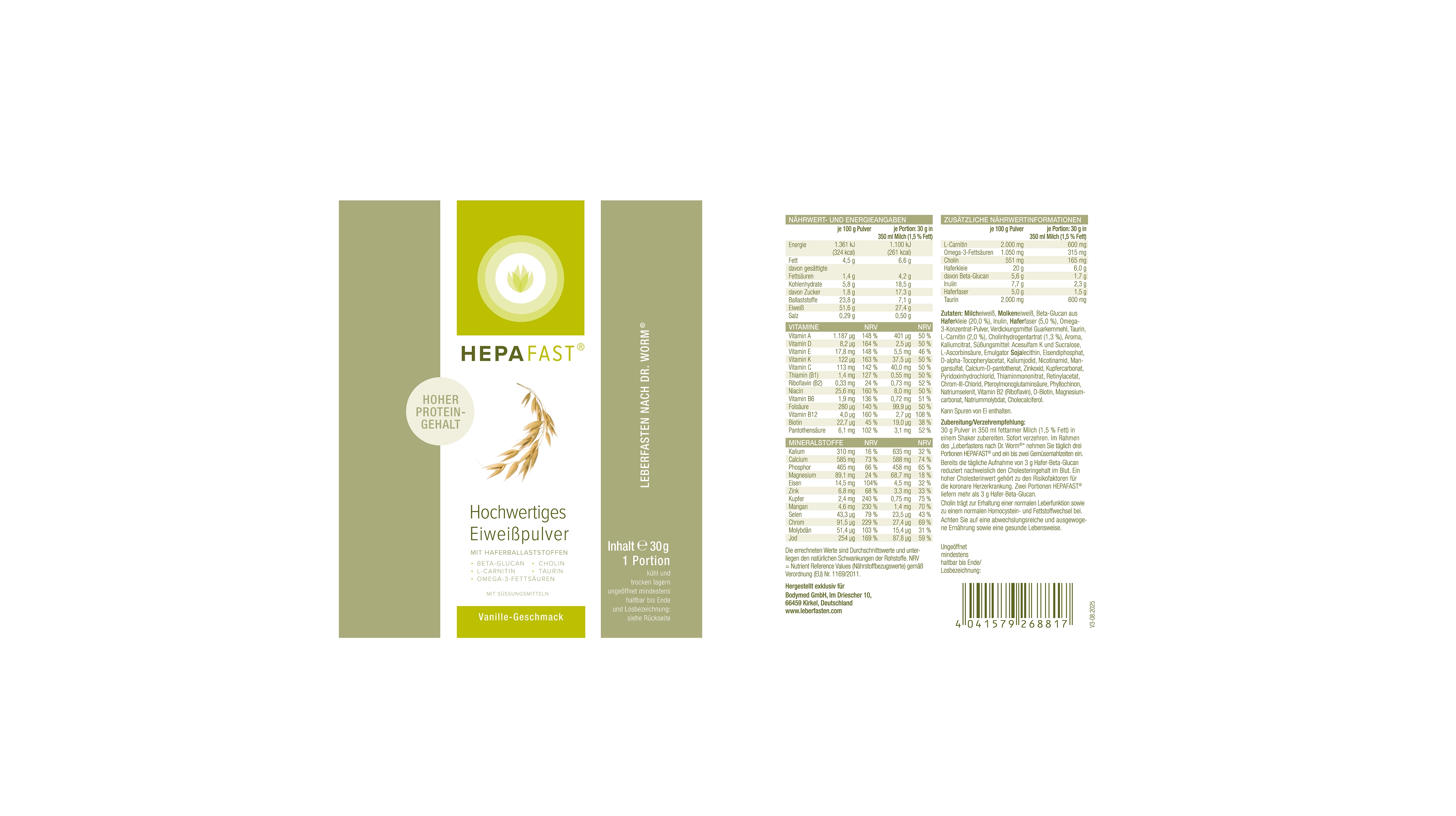 Entwickelt für Leberfasten nach Dr. Worm®, ist dieser leckere Protein-Shake nicht nur köstlich cremig, sondern liefert auch eine spezielle Rezeptur für den gezielten Abbau von Fett in der Leber und weiteren Organen. Die positiven Effekte der enthaltenen Wirkstoffe auf die Leberfunktion sowie den Fett- und Zuckerstoffwechsel sind in zahlreichen wissenschaftlichen Studien belegt. Hepafast® ist, neben der persönlichen Beratung, entscheidend für deinen Leberfasten-Erfolg und nicht mit handelsüblichen Shakes vergleichbar. Als hochwertiger Eiweiß-Shake liefert dir Hepafast® alle wichtigen Nährstoffe, die dein Körper braucht in optimaler Zusammensetzung. Daher erhältst du den hochwertigen Protein-Shake auch nur in Kombination mit einer persönlichen Beratung in deinem Bodymed-Center vor Ort oder hier im Bodymed-Webshop nach Eingabe deines persönlichen myKey-Codes, den du in deinem Bodymed-Center erhältst.